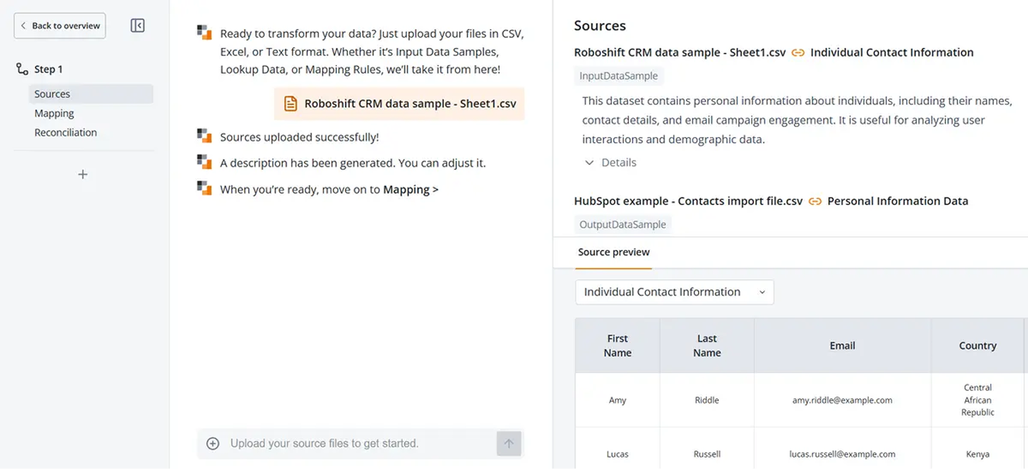 You can simply describe quality rules in everyday language and let Roboshift convert them into executable checks. By validating every row before it reaches the CRM, you prevent bad data from creeping into reports and workflows. The same repeatable flow can blend campaign metrics with prospect lists, and—when privacy regulations require it—run entirely on-premises without changing a single step.