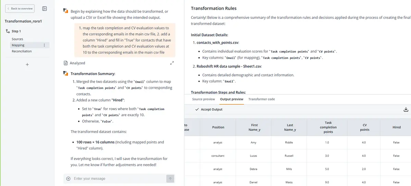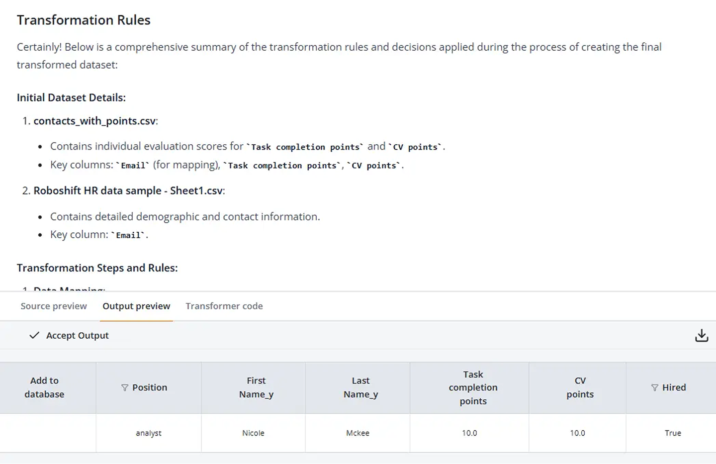 To decide who advances, the recruiter types a plain instruction: add a Hired column and set it to True when Task completion points and CV points both equal ten. Roboshift joins the records on Email, applies the rule, and displays the combined table almost instantly.